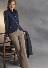 Another, more “fresh” outfit can be created by wearing narrower dark brown trousers and a tan jacket, adding contrast with the help of a blue shirt tucked into trousers and with rolled up sleeves. A brown bag with a long belt and matching shoes - this turned out to be a very exquisite image in sunny autumn weather.