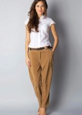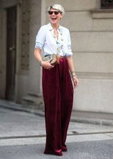 This style of trousers has become incredibly popular this season. It looks especially good on girls with a slender figure and thin legs. This option is perfect for a walk in the autumn park or for going to the cinema with friends. Looks harmoniously in wine or red-red color with light shirts or thin sweaters.