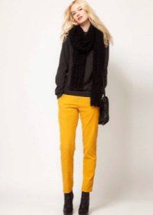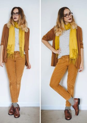 For example, red trousers will look incredibly stylish complete with a thin jacket of a similar color to them, a striped vest with a narrow strip underneath and a yellow scarf on top. Wear brown leather boots on your feet. Voila! It turns out a very cute, warm and cozy bow, which is perfect for study, walking and an informal meeting.