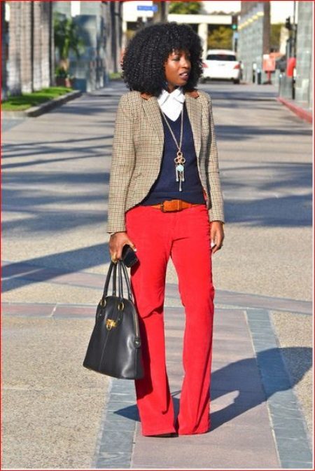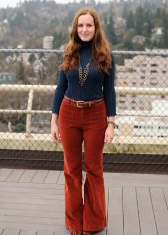 Another option is bright red-red flared trousers and a gray-and-blue ribbed turtleneck. A brown leather belt, an unusual chain, watches and high-heeled shoes can be a nice addition. By the way, this color of trousers is ideal for red-haired girls.