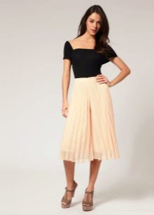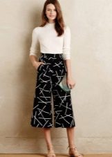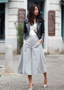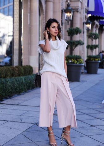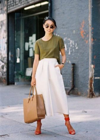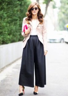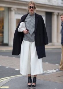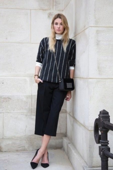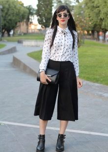 Regarding shoes, in most cases the rule works: a skirt-trousers should be combined with high heels.