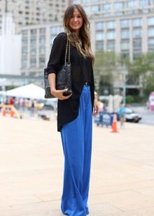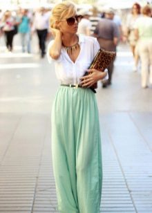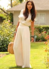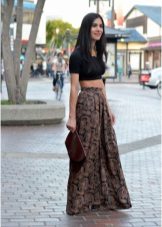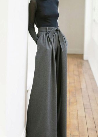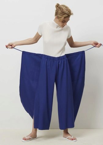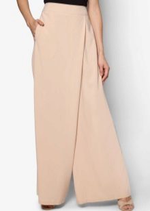 A modern skirt-trousers most often has a length to the middle of the calf or completely covers the legs. At the same time, she gracefully fits the waist area, as well as the upper part of the buttocks, smoothly going down in a free cut. The canvas itself can be either smooth or pleated. Landing is classic, high or low. The belt itself is made out both traditionally for trousers and simplified (for example, elastic is simply sewn in).