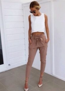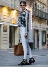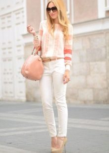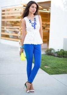 White skinny trousers are impractical, but very effective, especially in the summer, when it sets off tanned skin. Snow-white trousers look great with bright tops and shoes.
