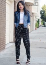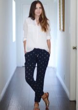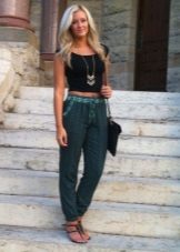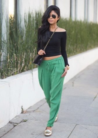 Loose hips trousers are suitable for girls with luxurious shapes. They will balance the magnificent breasts and hide the extra pounds in the hips. To look even more spectacular, emphasize the waist line with a wide belt (or choose pants with a high yoke).