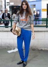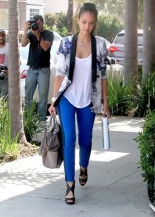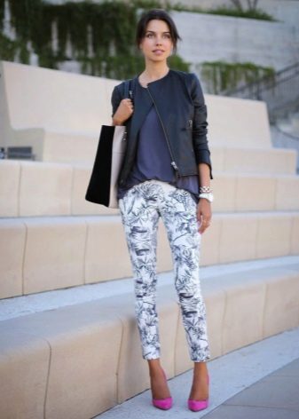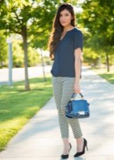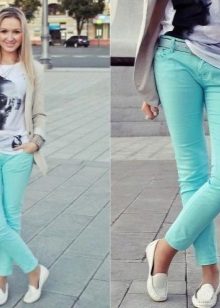 - Bright casual bow: turquoise trousers, bag of the same color, print T-shirt, light jacket and snow-white moccasins.
