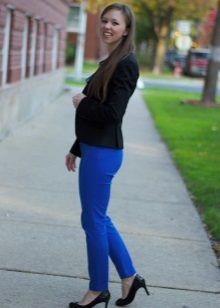 Blue pants can be an option for both business and casual wear. They are truly versatile, so they go well with a strict jacket and striped striped vest.