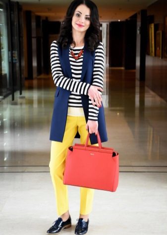 - Saturated shades: lemon trousers, coral bag, elongated blue vest, black and white striped sweatshirt and navy patent leather oxford shoes.