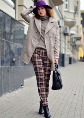 - For a cool autumn: bright tartan trousers, a loose sweater, a voluminous woolen coat, a purple hat, boots and a bag, matched to the tone.