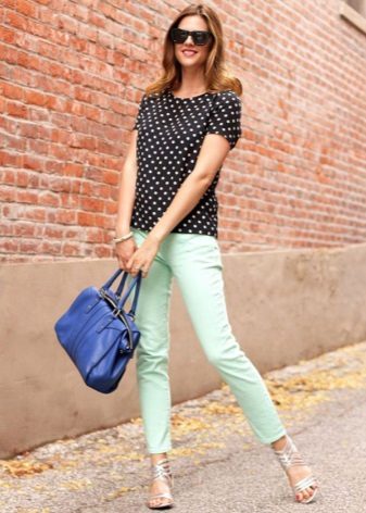 Mint pants have been very popular for the past few fashion seasons. This bright, summer coloring looks very beautiful and unusual, especially if you pick a top with a contrasting color to it.