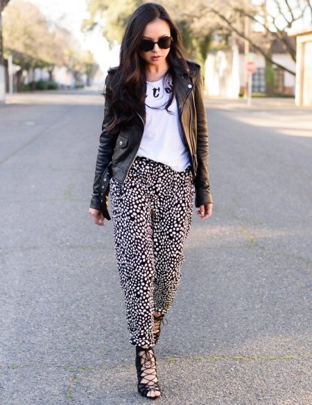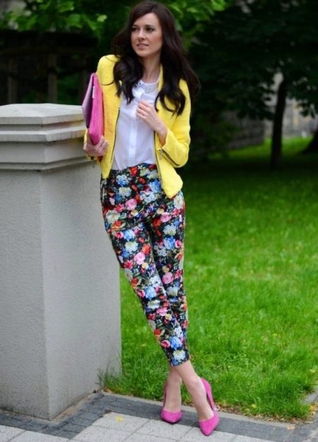 - Spring romance: tight-fitting trousers with floral print, light shirt, accessories in delicate, golden pastel colors and sandals with dizzy heels.