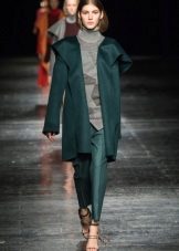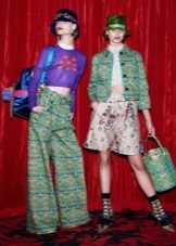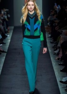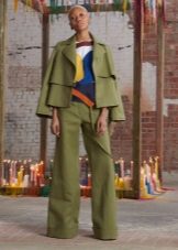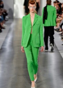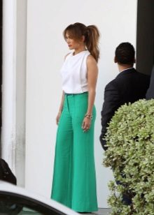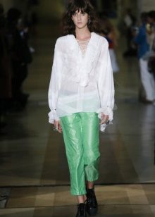 Incredibly beautiful is a light blouse with ruffles of light pink color and rich trousers of a straight cut of the color of fresh green. This outfit will look great in summer or spring.