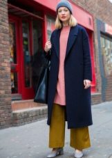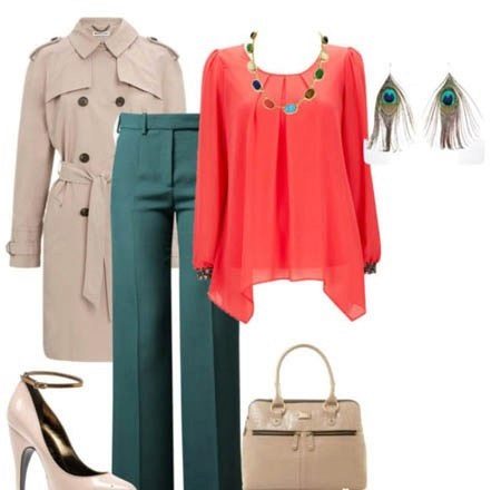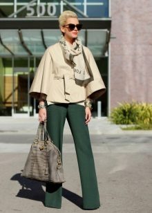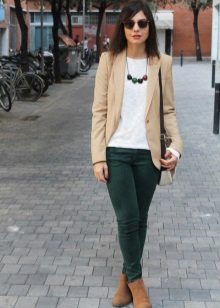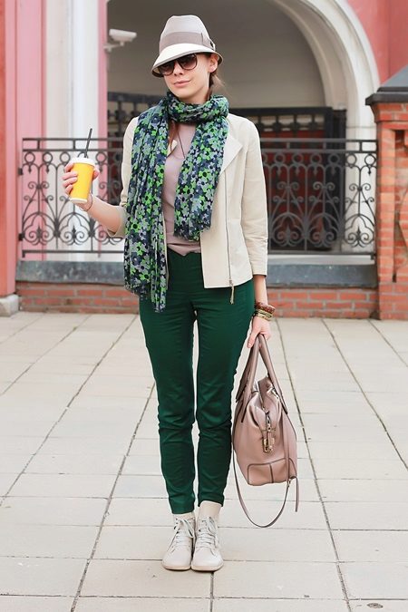 Now consider the fall option.When the weather is already getting cool, it's time for darker skin-tight pants. But you don’t really want all the bright and bright summer colors to go away! And rightly so - you can leave the trousers the darkest and make the top light, just wear a beige blouse and a jacket on top, but don’t forget about the weather - a bright green scarf with a fine print will perfectly complement the look. A bright hat, a bag and boots, some jewelry - you look great, even if the first cold days have already arrived.
