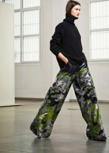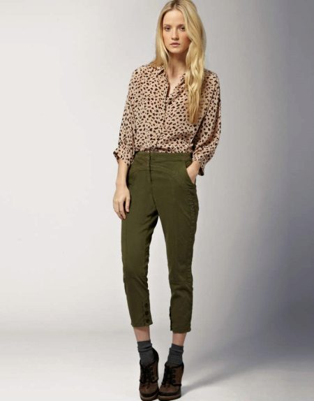 Another look, which is based on dark green pants, is in front of you. Such a model is suitable only for owners of slender long legs, because a shortened tight-fitting model can visually slightly change your height. So, a beige shirt with an animal print and brown ankle boots can make a perfect combination with them. A minimum of accessories, this is due to the unusual cut of the trousers and the color of the shirt, which attracts attention to itself.