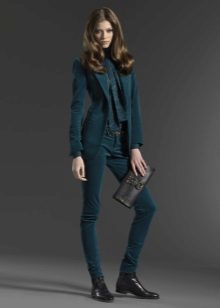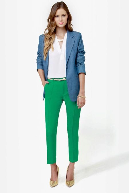 Another option, where straight green shortened trousers were also used, is more interesting. A white shirt is replaced by a V-neck blouse, under which a gold-plated necklace is put on, which looks very beautiful from under the blouse, and on top is a blue jacket. It's amazing how well this blue and green blends! And at the same time, gold jewelry, bracelets and a thin belt, are in harmony with the same gold boats.