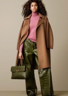 A great option for autumn is a brown leather jacket, a light shirt, green trousers, brown boots, possibly a hat and a scarf in a different green shade. Coffee brown goes well with olive color. This outfit is not very bright, but quite contrasting and perfect for swarthy brunettes.
