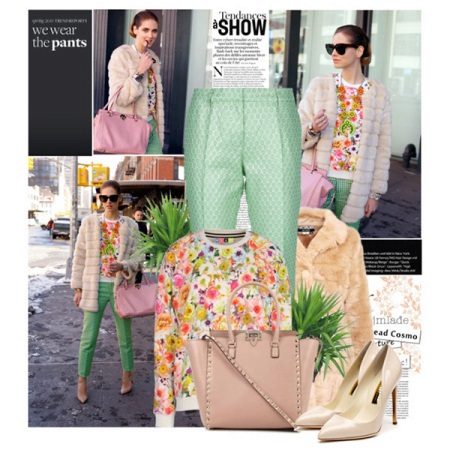 A spring look that flawlessly suits everyone. Light green cropped trousers of a direct silhouette, a bright jumper with floral patterns and a light fur coat, beige boats and a bag in tone. A strikingly balanced kit will work out if you think through all the details, but the most important thing is to learn the right color combinations. One way to do this is to try to notice the natural combinations in life and embody them in your outfits.