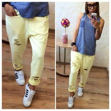 Sweatpants with holes may look a bit messy, so more restrained ensemble elements will be needed to create a stylish look. For example, a gray pullover or turtleneck and white slip-on sneakers without print.
