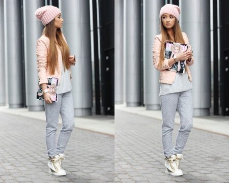 A delicate combination of quilted sweatpants made of knitted fabric and a pink leather jacket looks very romantic and neat, creating a light and delicate look.