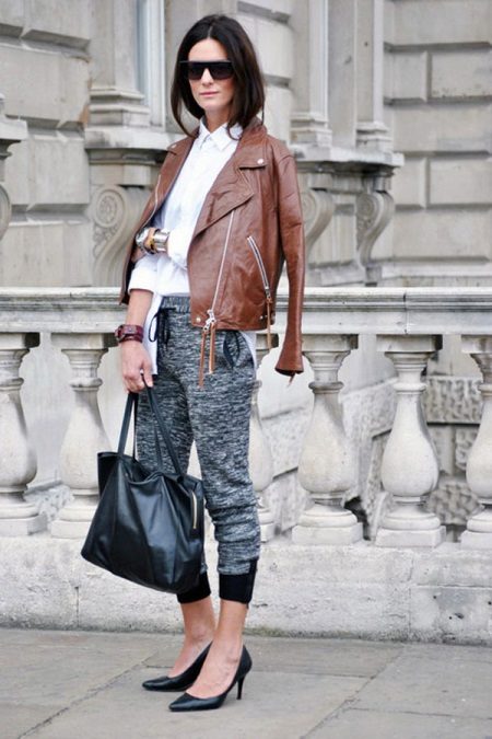 - A leather jacket, an ordinary cotton shirt are perfect for knitted sweatpants - joggers or bananas.