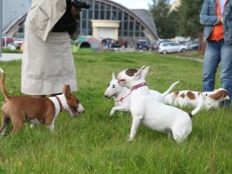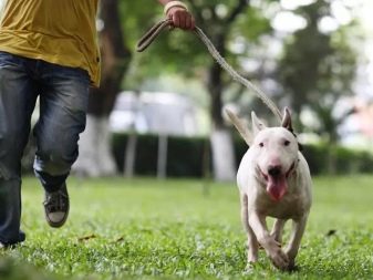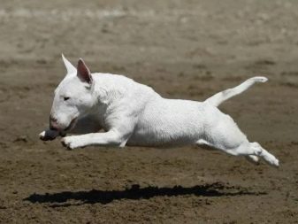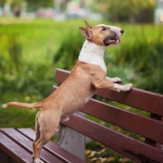 - Activity. Standard bull terriers themselves are an incredibly active dog breed - they do not like to be in one place for a long time, they love to play with the owner in the fresh air and in the walls of the apartment. Some may think that since mini-boules are smaller than their relatives in size, then there is less agility in them, however, with miniature bull terriers, everything is exactly the opposite. They are twice as fast, agile, more fond of adventures and tomfoolery. Sometimes these dogs can play so hard that they simply cannot be stopped - for families with small children this can be a lot of problems. Kids do not notice when playing with a dog goes beyond entertainment, and the pet, in turn, can forget who it is dealing with. To avoid these incidents in the walls of the apartment, you should constantly load the dog physically - go out with her for jogging, get out into large fields and throw frisbee or balls so that the dog brings them.The best option would be special platforms for training dogs - there are all the necessary simulators for effective exercises.
