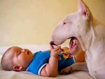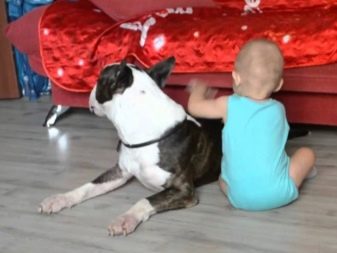 In small family members, bull terriers see not only supporters for fun and games, but also serious competitors for the owner’s attention. The main part of the problems arises when a small child appears in a family with an adult bull and all the attention of the owners switches to the baby. These dogs can not understand for a very long time why the owner’s attention is so attached to the infant, and therefore are able to be capricious or even shut themselves in. To prevent such situations from happening, you should make the pet friends with the child on the very first day of appearing in the house, and try not to belittle your attention to the dog. As soon as the child is a little older, he should be taught to respect the bullet - these dogs do not understand and do not accept teasers and persistent behavior.