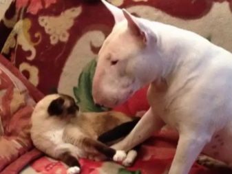 Bull terriers are not particularly rosy about other domestic animals, and if it comes to the attention of the owner, then they can go to the most vile dirty tricks in relation to another pet.Feeling their physical superiority over other domestic animals, these dogs can resort to real tyranny: stealing food from someone else's bowl, intimidation and violation of personal space. To avoid this, you need to try to be equally friendly to the pets, at the same time give them food and stop any terror attempts by any of them. An ideal option would be a house where animals grow together since childhood - in this case, they will surely become good friends and will always protect each other.