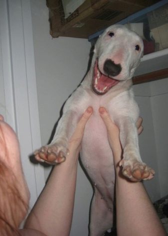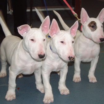 The breeding research of the breeder lasted about 10 years, and their result was the presentation of the first representative of the breed at the exhibition in 1862. The presented individuals, which received the name of the white bull terrier, unlike their congener of the bull and terrier, had a more elongated graceful body, an elongated oval head, smooth lips and dense elastic skin. In addition, despite the grace and elegance of the new breed, Hinks was able to preserve in it the best features from fighting dog breeds - a remarkably developed muscular system, powerful jaws and fangs.