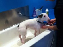 Bull terriers have a short coat, so they do not need daily care for it. The dead hairs are combed out three times a week, while a brush with stiff bristles is used. When the pet will molt, and this is the autumn and spring periods, experts recommend buying a special mitten for trimming. It should also be remembered that boules are very susceptible to allergies, so for the summer, stock up on products that will protect the pet’s hair from ticks and other parasites. A good solution is to constantly wear an antiparasitic collar.