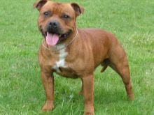 - The Staffordshire breed is more sedate and slow, the muzzle resembles a bulldog. It was bred due to the crossing of a bulldog and a terrier. It can have different types of color, tiger, brown and red colors are very common.