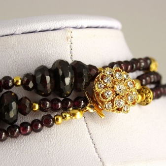 - It is worth remembering that when putting on pomegranate beads, you should refuse any other jewelry. This is especially true for earrings made of gold and silver. Only various accessories containing one stone will look harmonious.