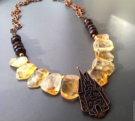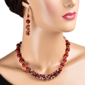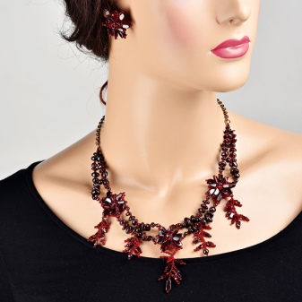 Gold simply looks fabulous with garnet of dark red color. Beads with similar elements are not only beautiful, but also mysterious. Their design is able to give the lady a special chic and elegance.