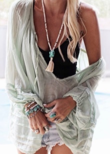 - Beads look great with blouses and shirts made of thin fabrics. They will look especially impressive against the background of a slightly open collar (for 3-4 buttons).
