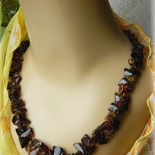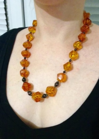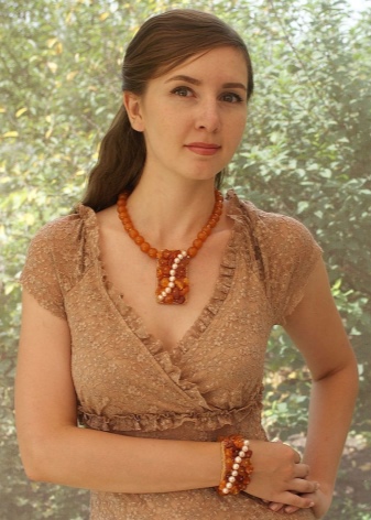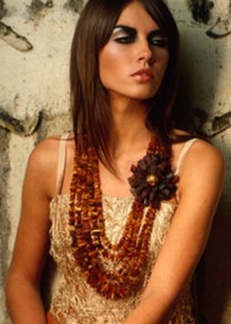 - A chic amber necklace will be a great addition to an orange evening dress. It will look especially impressive on the owner of a chocolate or nut shade of hair.