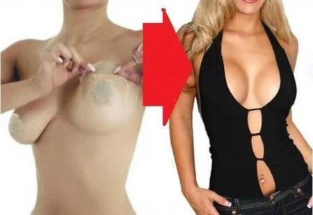 There is another way to lift your chest. Self-adhesive Bare Bra breast stickers are now actively offered in the lingerie market. One type of them is intended for gluing to the middle part of the chest, and then, lifting the chest, is fixed on the upper part of the chest. Thus, it creates a lifting effect. Another type of sticker is used to attach to the lower chest for the same effect.