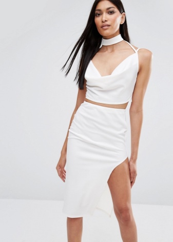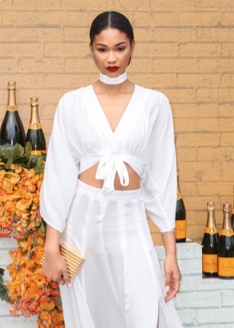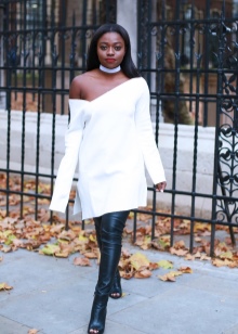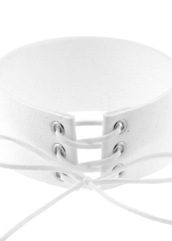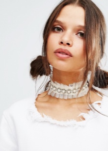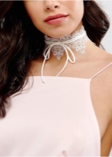 White choker perfectly decorates a business suit. It can be a strict classic, consisting of a jacket, blouse and trousers. A model in the form of a thin cord made of genuine leather is perfect for such an image. Thanks to thin straps, the accessory can be twisted around the neck several times, and the free ends are lowered. It is these styles that are recognized today as a squeak of fashion.
