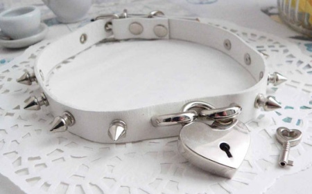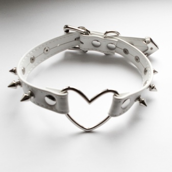 The pendant clasp is very peculiar and often becomes the accent of a laconic model. For example, a choker can be a strip of genuine leather of white color, and a fastener can be elements of a large chain with a clip-pendant in a metal frame. Such a lock is attached to the grommets.