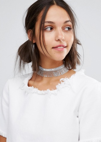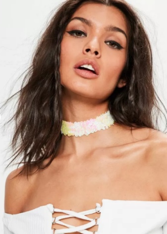 Among current trends, the combination of jewelry is popular. Choker can be combined with chains or pendants. This combination looks good with a dress on the floor or a T-shirt worn over a lace top.