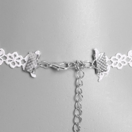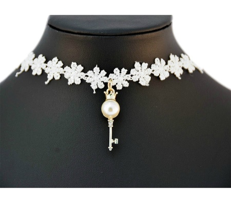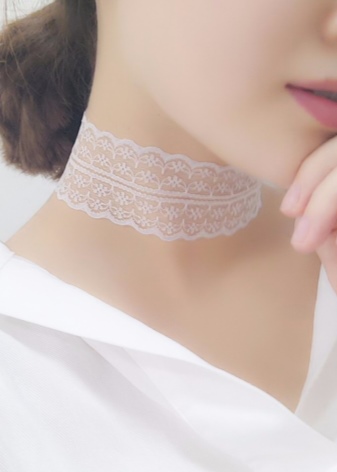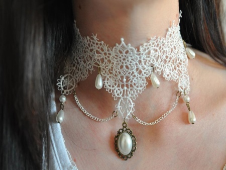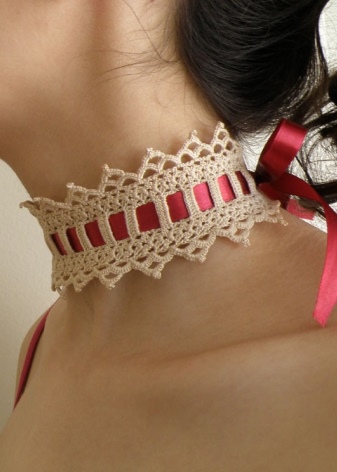 The necklace can be made of the finest threads, lace stripes, knitted fabric. Width varies from very thin to wide.Often the style resembles the thinnest cobweb. Lace patterns are decorated with pearls in the form of beads or drops. Individual styles are decorated with satin flowers in pastel shades, rhinestones, sparkling crystals or stone in the frame.