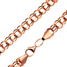 If you like fantasy chains, then you should pay attention to the jewelry made according to the type of weaving “Rebecca”, which belongs to the armored twist. The peculiarity is that the links are placed sequentially. They can be polished on both sides and still have a diamond cut. The links form a complex weave. Openwork pattern will appeal to every woman.
