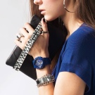 - A fashionable watch with a black round dial will look impressive against a background of leather jackets, jeans and a white top. Such an ensemble will create a bold and bold image.