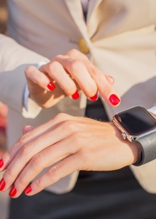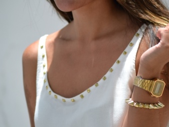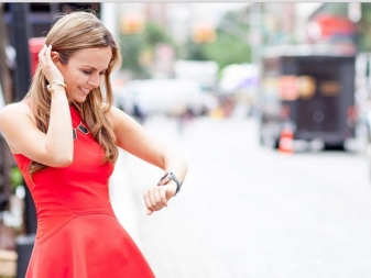- A smart watch with a silver or golden case and a leather strap will harmoniously look in the ensemble with a light coral or red dress, complemented by a dark necklace and thin heeled sandals.