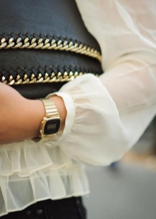 - Bright watches with large digital symbols can be combined with casual or sports outfits.Pick up a light sports jacket and complete it with leggings or sweatpants. The set will turn out simple and stylish.
