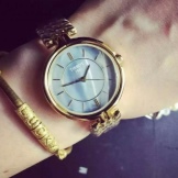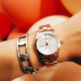 Manufacturers are trying to diversify the lines of women's accessories with original designs. So, in the collection were added models with a gold case and a strap made of genuine leather or fabric, and samples in which white and yellow gold alternated in a case and bracelet. Accessories with diamonds located both around the perimeter of the dial and over the entire surface of the case and strap are in demand.