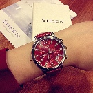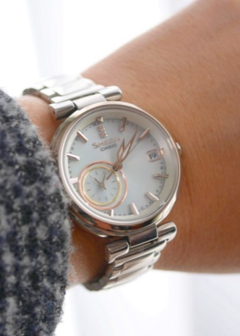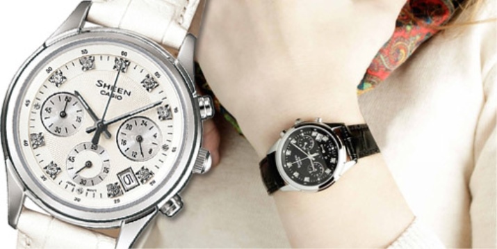 - A beautiful watch from the Sheen line looks very impressive on a ladies' pen. They have a very elegant and sophisticated design that is very different from traditional Casio products. Feminine accessories attract attention thanks to elegant lines and beautiful color combinations. For example, a white dial with a silver border against the background of a red strap or a watch with a blue bracelet equipped with gold details just looks amazing. Belts in them can be metal or polymer. A lady who prefers any style in clothes and accessories can choose the right product.