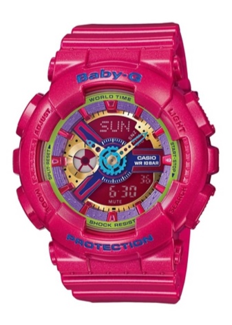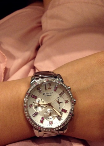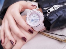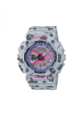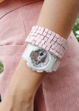 - Another popular female model is the Baby-G watch. Their design is made in sports style. These comfortable and bright watches have shockproof characteristics. They are ideal for energetic girls leading an active lifestyle. Such useful devices are equipped with ultra-precise stopwatch. Baby-G watches are distinguished by their rich colors. On fashionistas, models of bright pink, white or salad color look spectacular. Such color schemes are provided so that the fashionable gadget looks harmoniously in the ensemble with a bright sports suit.