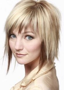 Asymmetric long bangs, beveled on one side, will help to make the face more elongated and bring it closer to the regular oval shape as well as ragged beveled.