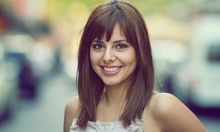 Such bangs are good for long bangs, reaching the bottom line of the eyebrows or even longer. Experts advise to perform a slice in the form of a small semicircle - this is the so-called bang-arch. It is necessary to pay attention to the fact that in the type of an elongated oval, you should slightly adjust the face in height, and if you are the owner of thick hair, then a thick long haircut is one of the most suitable options.