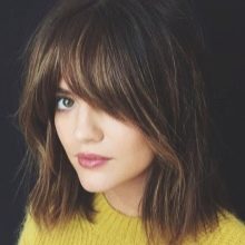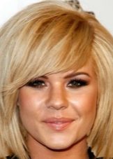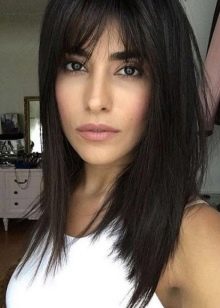 The bangs obliquely or diagonally end below the brow line. She perfectly corrects the facial features of girls of elongated and rectangular shape. The bangs with a corner perfectly mask the prominent frontal part.