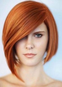 The haircuts of the square go well with short bangs. They should start from the hairline and end at the level of the eyebrows.