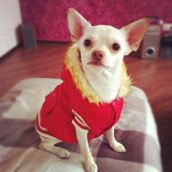 Owners should understand that for a white Chihuahua, clothing is a necessary attribute, which is an additional protection for the dog from pollution, since it is recommended to bathe the animal no more than 5 times a year to preserve its fat layer of the skin.